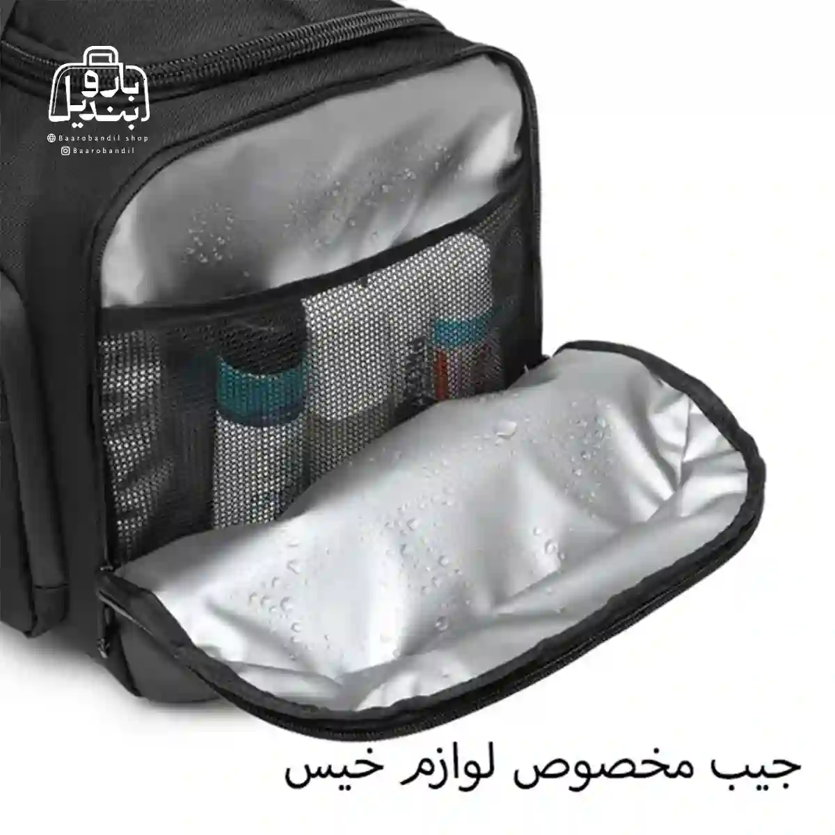 تقسیمبندیهای داخلی | فضای اصلی , دارای تفکیکهای داخلی مناسب , دارای زیپ و جیب داخلی , محفظهٔ لباس خیس , محفظهٔ کفش |