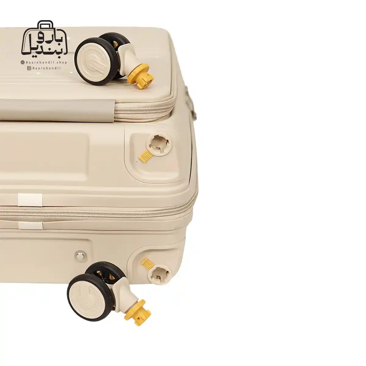 توضیحات چرخ چمدان سایز کوچک | چرخهای ۳۶۰ درجه , سایلنت , نرم و روان , دارای چرخهای آنتیشوکدار , با قابلیت جداشوندگی , دارای پین فلزی , چرخها از جنس بدنهٔ چمدان , پایهٔ چرخها در داخل چمدان تعبیه شده |