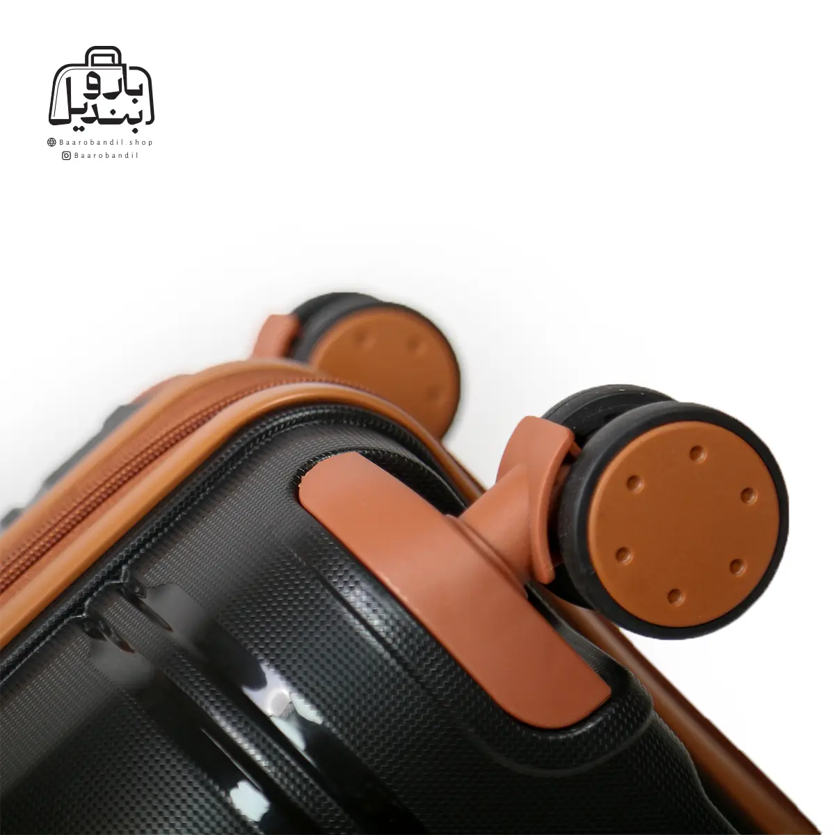 | توضیحات چرخ چمدان سایز کوچک | چرخهای ۳۶۰ درجه , سایلنت , نرم و روان , پایهٔ چرخها در داخل چمدان تعبیه شده |